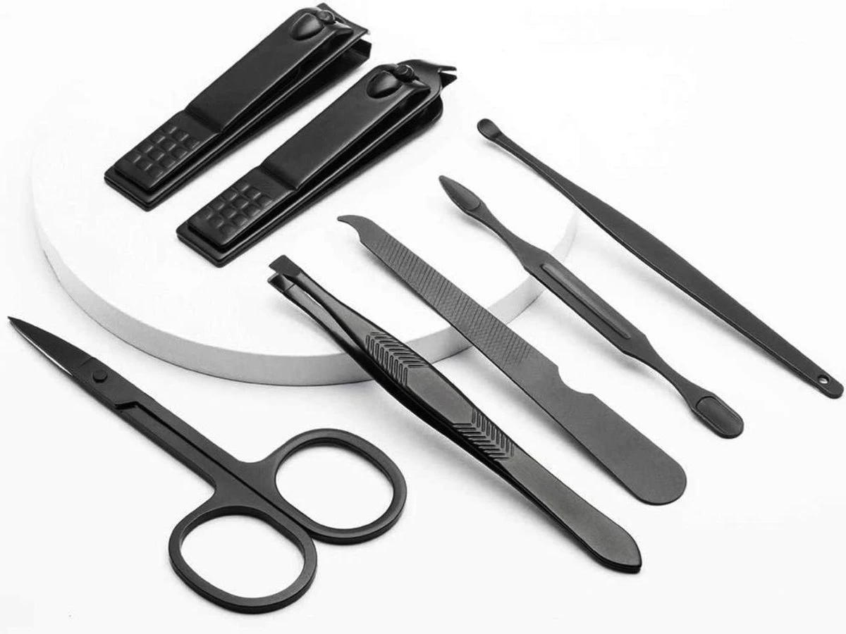 - Handverzorging (normale nagelknipper, schuine nagelknipper, nagelschaar, nagelvijl); voetverzorging (normale nagelknipper, schuine nagelknipper, nagelschaar, nagelvijl); gezichtsverzorging (wenkbrauwpincet, oorreiniger)