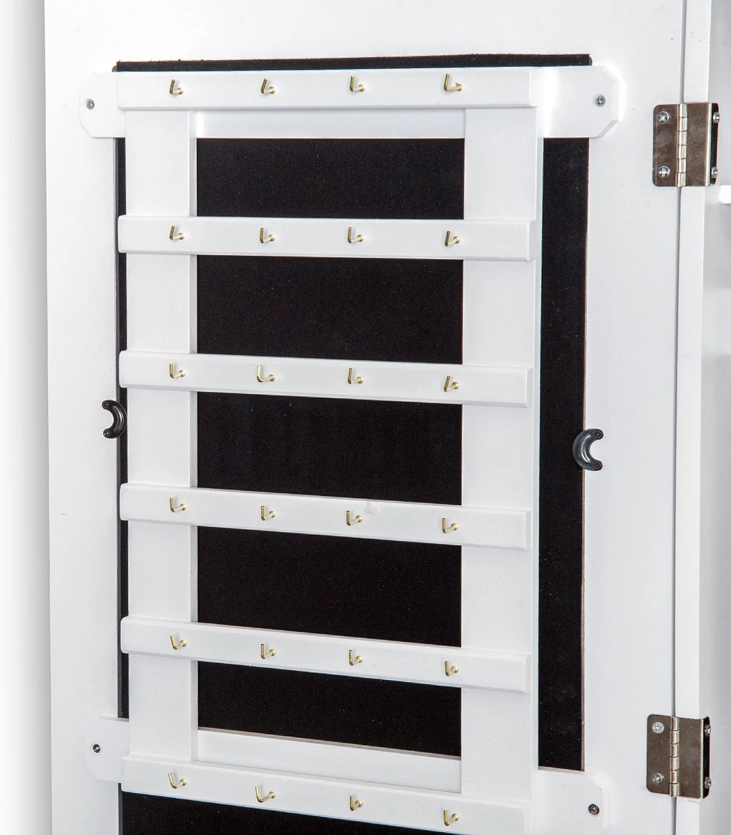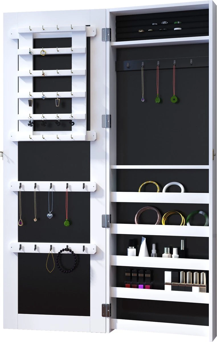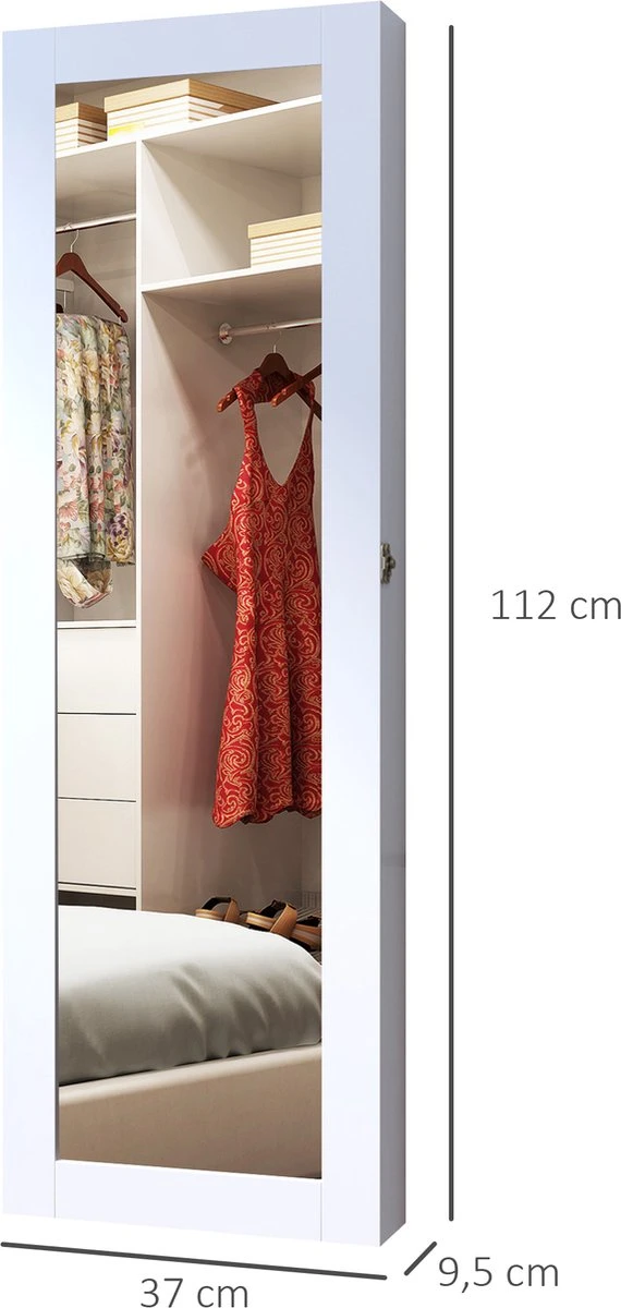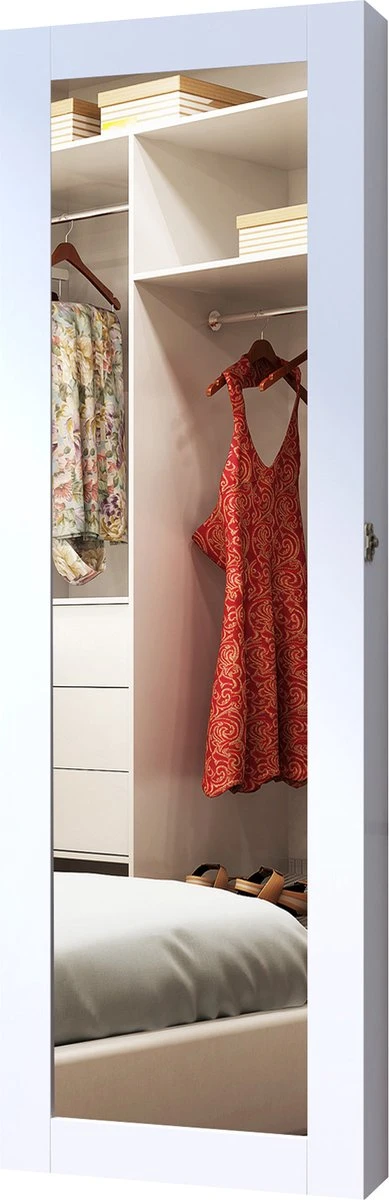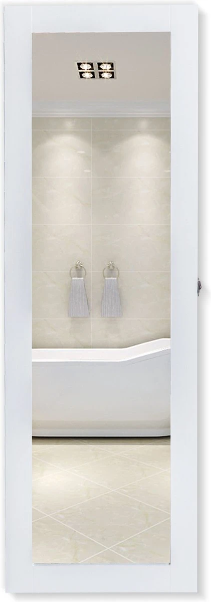 Elke vrouw heeft een eigen sieradencollectie. De manier waarop je deze bewaart, is net zo uniek als je collectie zelf. Of het nu gaat om enkele sieraden of hele collecties. In die zin hebben sieradenkasten altijd een extra functie, namelijk voor orde zorgen. Onze sieradenkast in elegant wit combineert functionaliteit met eenvoudig en modern design. De tijdloze look past perfect in vrijwel iedere slaapkamer. De spiegeldeur fungeert niet alleen als bescherming voor je sieraden, maar kan ook als kledingspiegel gebruikt worden. De binnenkant is bekleed met extra zacht flanel, zodat je sieraden veilig opgeborgen kunnen worden en niet gekrast kunnen worden. Ook zit er een groot aantal haken, vakken en opbergmogelijkheden in de kast. De deur kan veilig worden vergrendeld om te voorkomen dat je waardevolle spullen vol stof komen te liggen. Eigenschappen: · Klassiek design in wit · 2-in-1 sieradenkast met spiegel · Met veel vakken, zodat je sieraden netjes opgeborgen worden · De binnenkant van de kast is voorzien van fijn flanel · Alle materialen zijn milieuvriendelijk · Duurzaam en stevig ·Makkelijk schoon te maken Technische gegevens: ·Materiaal: MDF (E1), spiegel ·Totale afmetingen: 37 l x 9,5 b x 112 h cm ·Afmetingen spiegel: 101,5 l x 26 b cm·Kleur: Wit·Gewicht: 8,9 kg · Omvang van de levering: 1 x spiegelkast · Verzendbriefje: Geen verzending naar Nederlandse eilanden.