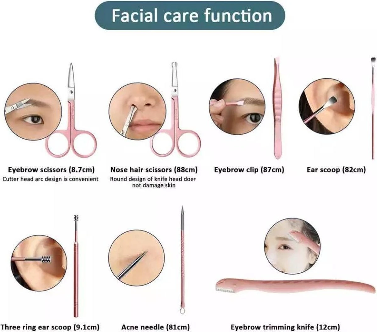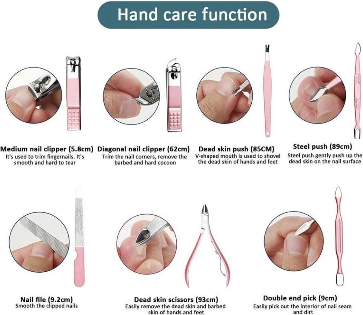 1 x Nagelknipper, Cuticle pusher, Nagelvijl, Nagelmes, eeltverwijderaar, Wenkbrauwschaar, Pincet, Spiraal om oorsmeer te verwijderen, nagelknipper (diagonale) en nagelknipper groot