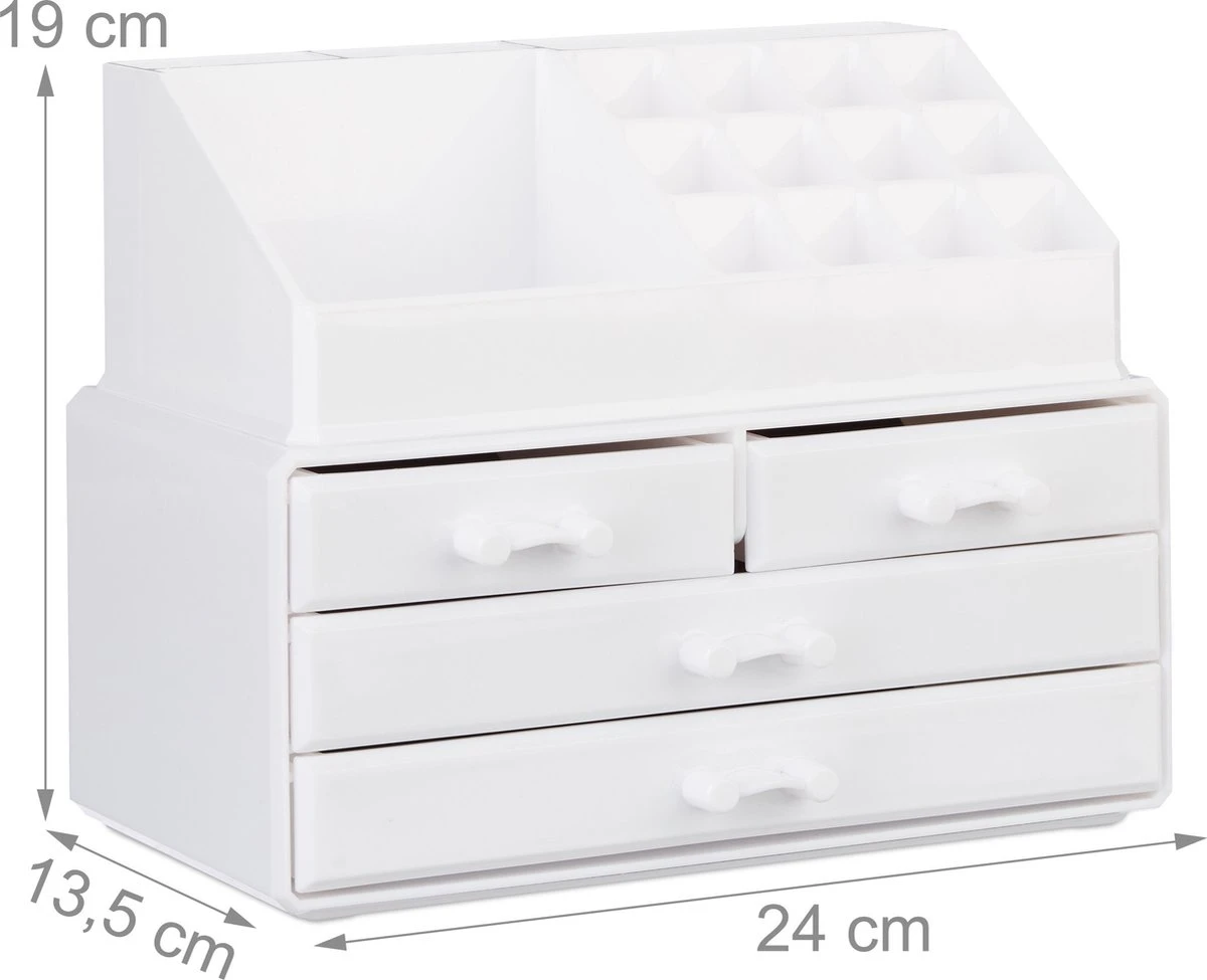 De stapelbare make-up organizer zorgt voor orde op je kaptafel en bespaart je het zoeken in je toilettas. De tweedelige make-up standaard biedt met veel opslagruimte voor cosmetica en sieraden. De lades zijn geschikt voor crèmes, poeder en oogschaduw, als ook voor ringen, kettingen en armbanden. De praktische houder voor lippenstift is ook geschikt voor nagellak, borstels, stiften en nog veel meer. Ook als bureau organizer of als opbergbox voor schroeven en gereedschap doet hij het zeker goed.
