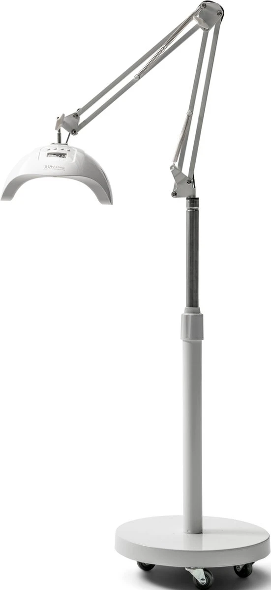 Met deze nieuwste Generatie UV LED-lamp 80W voorzien van STATIEF verkort u de behandeltijd met meer dan 50%. Deze unit is geschikt voor allerlei soorten gellakken & reparaties en zorgt voor snel uitgeharde nagels. De LED technologie maakt de lamp betrouwbaar, snel en hard de gehele nagel gelijkmatig uit. De SUNfeet bestaat uit twee delen een UV-ledlamp voorzien van een rijdend statief. Aan de bovenzijde bevindt zich een display met een timer en knoppen voor het selecteren van de uithardingsvariant, namelijk 10s, 30s, 60s en 99s..